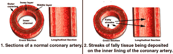 The two pictures on the right show deposits known as fatty streaks that are made up of fatty substances. They are only minimally raised and do not interfere with the flow of blood through the artery.